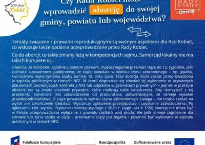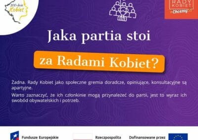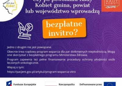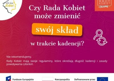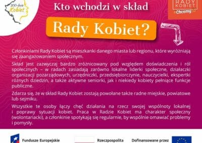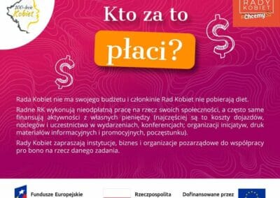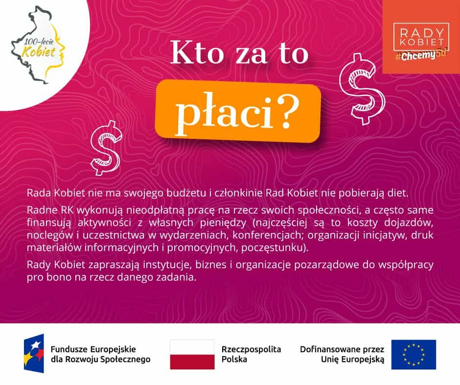 Często praca Rady Kobiet pokrywa się z zadaniami publicznymi realizowanymi przez np. gminę i wtedy efekty pracy Rady są np. finansowane ze środków publicznych – np. wyremontowany pokój do przychodni miejskiej, o który wnioskowała wcześniej Rada. To mogą być działania profilaktyczne, np. związane z Różowym Październikiem i profilaktyką raka piersi oraz szyjki macicy, również zadaniem publicznym.