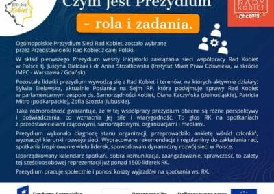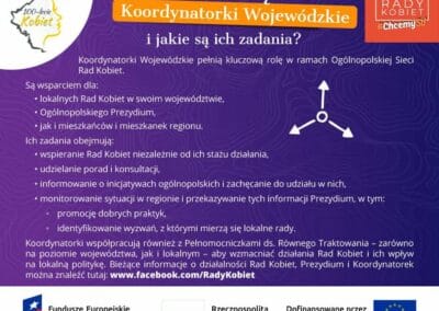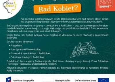 Sieć organizuje wspólne inicjatywy – takie jak Fora Rad Kobiet – oraz opracowuje jednolite standardy działania i komunikacji, co sprzyja większej przejrzystości i stabilności ich funkcjonowania, niezależnie od zmieniającej się woli władz lokalnych.