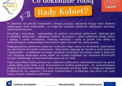 Doradzają i konsultują – wypowiadają się podczas konsultacji społecznych, zabierają głos w debatach publicznych, sygnalizują osobom decyzyjnym i opinii publicznej tematy ważne i apelują o różne rozwiązania, analizują inwestycje i plany w gminie oraz dzielą się rekomendacjami, podpowiadają mieszkankom, gdzie kierować się z daną sprawą.